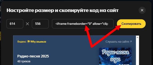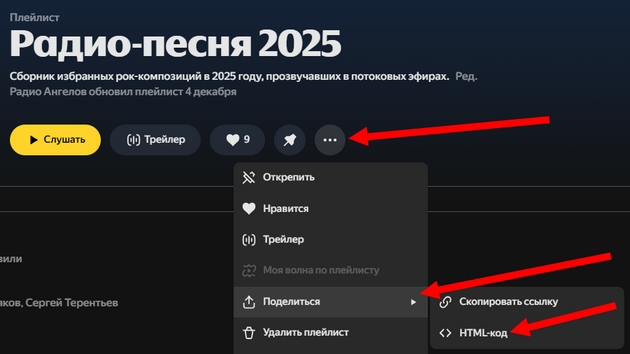 1. После создания плейлиста, нажмите на иконку в виде трёх точек и выберите «Поделиться» - «HTML-код», чтобы открыть код для вставки плейлиста на сторонние ресурсы. Смотрите на скриншоте: ![]() 2. Скопируйте HTML-код в окошке или кнопкой «Скопировать». Вставьте код в любой текстовый редактор на своём компьютере, например, «Блокнот», чтобы увидеть весь код. Смотрите на скриншоте: ![]() 3. Найдите в HTML-коде адрес плейлиста, который будет выглядеть так: https://music.yandex.ru/iframe/playlist/Ваш логин/ID плейлиста - скопируйте и вставьте свой логин и ID плейлиста из адреса в поле «Плейлист в «Яндекс Музыке» изменения своего личного профиля на «Радио Ангелов». Нажмите «Обновить профиль», чтобы сохранить изменения и отобразить плейлист в профиле. Смотрите на скриншоте: ![]() |