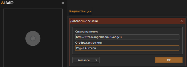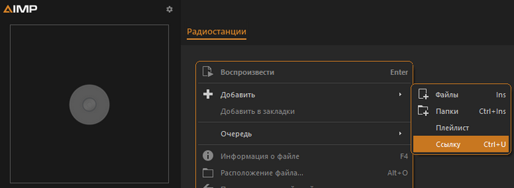 Для прослушивания радио в медиа-плеере «AIMP» (скачать можно с сайта плеера бесплатно на русском языке): откройте плеер, нажмите правой кнопкой мыши на любом пустом месте плейлиста в плеере, выберите пункт «Добавить», затем «Ссылку» - показано на скриншоте: