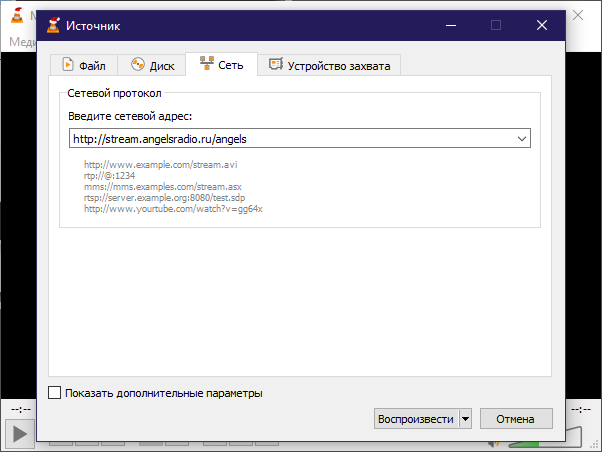 Вставьте скопированную ссылку (список ссылок вещания указан ниже на странице) в поле «Введите сетевой адрес». Пример на скриншоте: