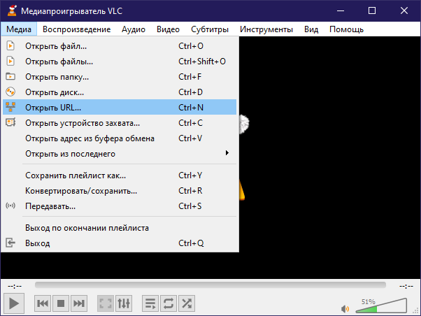 Для прослушивания радио в медиа-плеере «VLC» (скачать можно с сайта плеера бесплатно на русском языке): откройте плеер, нажмите левой кнопкой мыши на меню «Медиа», затем «Открыть URL...» - показано на скриншоте: